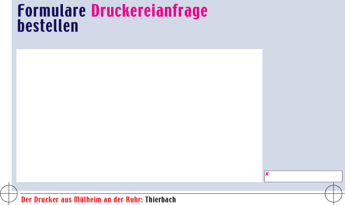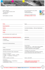 Bitte senden Sie mir Formulare für die Druckereianfrage, damit ich einfach und schnell die Kosten für unsere Drucksachen ermitteln kann. Bitte noch einige Infos zu Ihrer Person, für eine gute Kommunikation: Anrede Frau Herr Name, Vorname Firma Ihr Aufgabenbereich Straße, Nr. Postleitzahl, Stadt Telefon, Fax